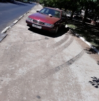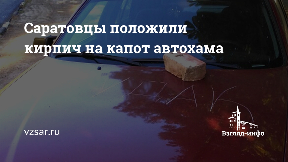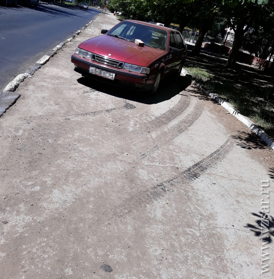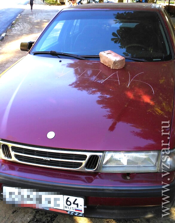 На фото видно стоящий на пешеходной зоне возле КПП бывшего артиллерийского училища "SAAB". Выбранное водителем место парковки на Артиллерийской понравилось не всем горожанам, и в данный момент процарапанное оценочное суждение саратовцев красуется на капоте автомобиля вместе с кирпичом.