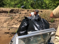 "Отдыхающим на островах участники субботника предлагали присоединиться к акции, и многие с радостью брали инвентарь и мусорные пакеты, чтобы помочь в расчистке своих излюбленных мест отдыха. В это время, пока убиралась береговая линия, дайверы и подводные охотники обследовали дно. Руководитель комитета охотничьего хозяйства в гидрокостюме возглавлял группы ныряльщиков. Были обнаружены вентеря с живой рыбой, которые в период нереста являются запрещенной снастью для лова. В присутствии инспекторов Рыбнадзора, орудия лова были изъяты из воды, а живая рыба выпущена обратно в Волгу", - говорится в сообщении.