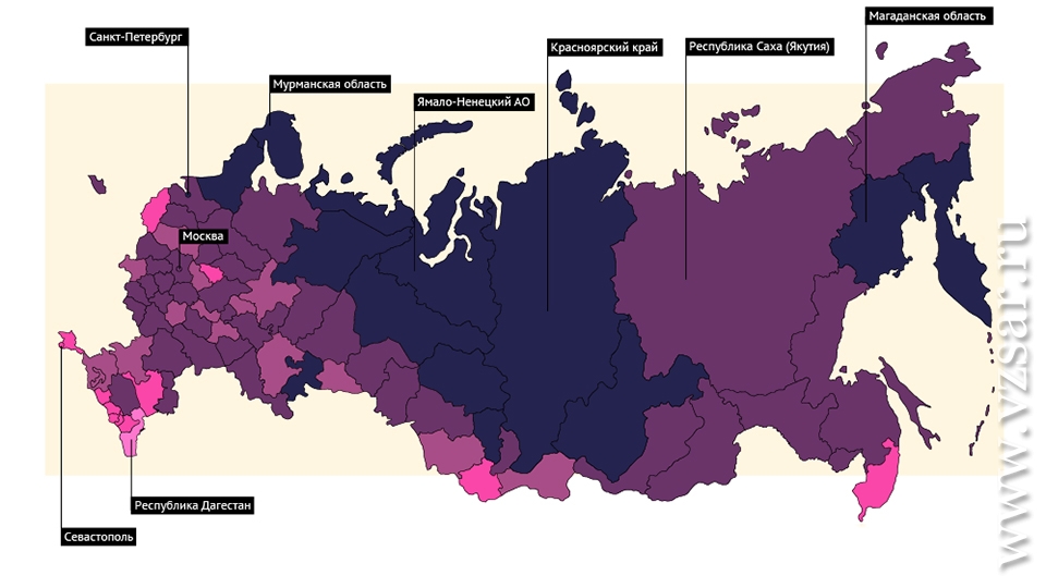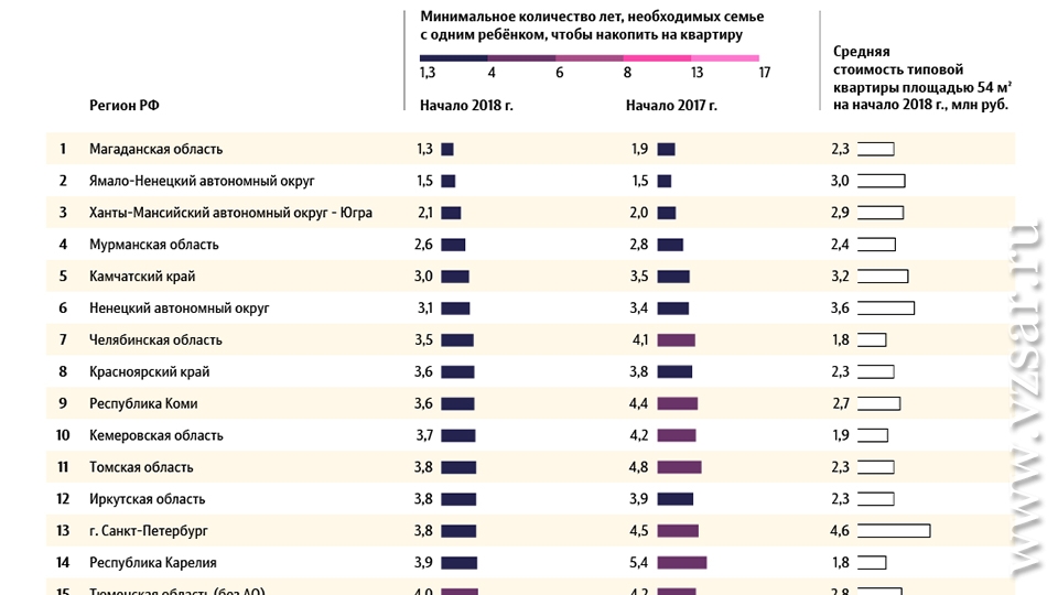 Критерием было выбрано минимальное количество лет, которое требуется семье с одним ребенком и среднестатистической зарплатой, чтобы накопить на квартиру без привлечения заемных средств. Считается, что семья откладывает остаток денег после минимально необходимых трат (прожиточный минимум в регионе для взрослых и детей) и использует накопленные депозиты на 1 апреля 2018 года.