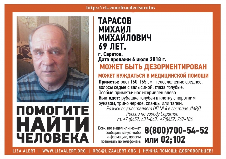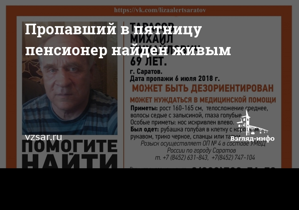 Вчера вечером был найден пропавший в минувшую пятницу в Ленинском районе Саратова 69-летний Михаил Тарасов. Об этом сообщают волонтеры отряда "Лиза Алерт Саратов".
