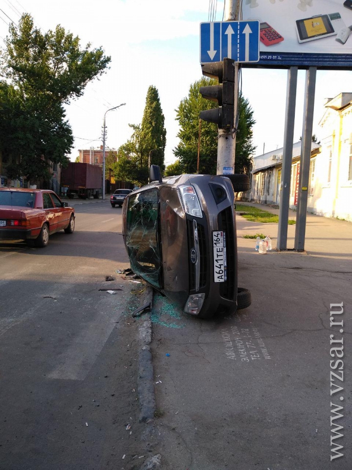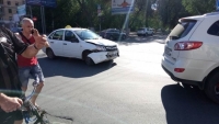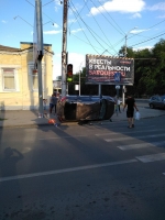 По словам очевидцев аварии, водитель такси выехал на перекресток на желтый сигнал светофора и врезался в другую "Гранту". В результате "атакованная" легковушка вылетела на тротуар и опрокинулась.