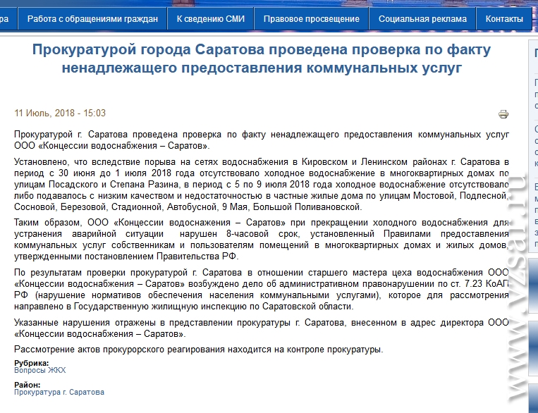"Таким образом, ООО "Концессии водоснабжения – Саратов" при прекращении холодного водоснабжения для устранения аварийной ситуации нарушен 8-часовой срок, установленный правилами предоставления коммунальных услуг собственникам и пользователям помещений в многоквартирных домах и жилых домов, утвержденными постановлением правительства РФ", - сообщает прокуратура.