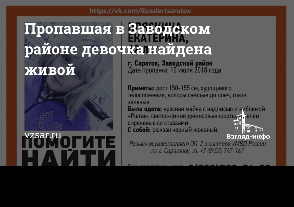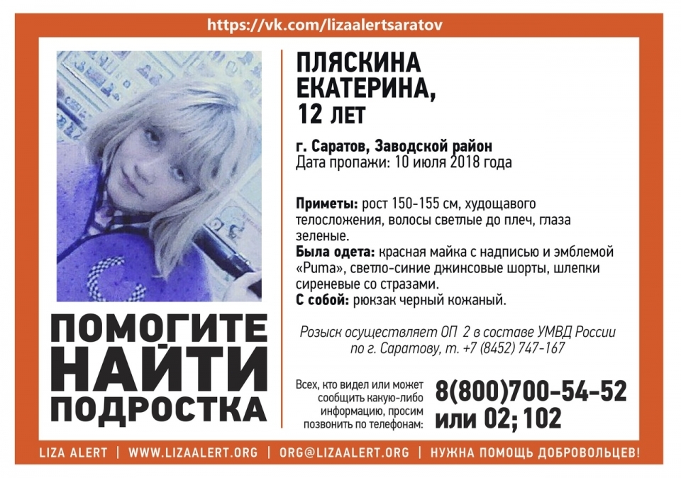 Пропавшая без вести в Заводском районе Саратова 12-летняя Екатерина Пляскина найдена живой. Об этом сообщают волонтеры сообщества "Лиза Алерт Саратов".