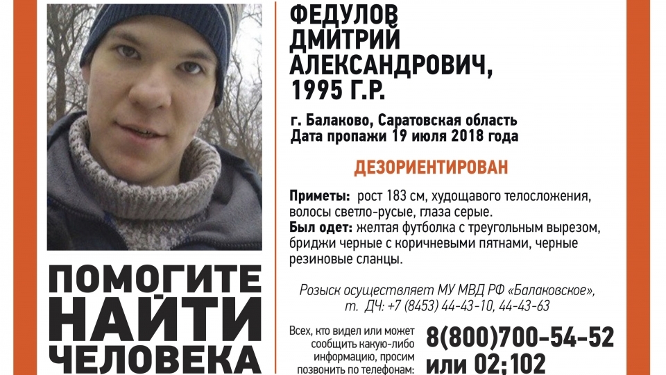 Пропавший без вести в Балакове Саратовской области 23-летний Дмитрий Федулов найден. Об этом сообщают волонтеры сообщества "Лиза Алерт Саратов".