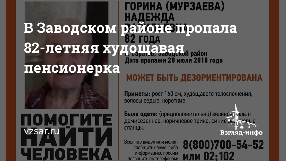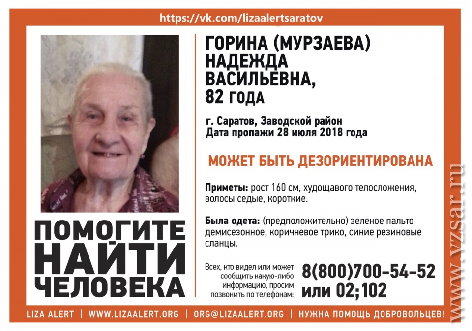 В Заводском районе Саратова разыскивается пропавшая без вести 82-летняя Надежда Горина (Мурзаева). Пропавшая вчера пенсионерка может быть дезориентирована, информируют волонтеры "Лиза Алерт Саратов".