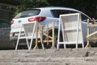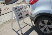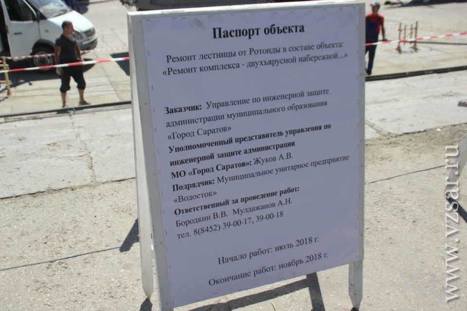 Согласно информации на баннере, заказчиком реконструкции является управление по инженерной защите администрации Саратова, подрядчиком выступает МУП "Водосток".