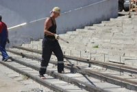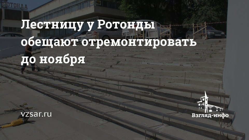 Как гласит соответствующее объявление, ремонт лестницы у Ротонды "в составе двухъярусной набережной" начался в июле и должен быть завершен к ноябрю. Сейчас место работ ограждает предупреждающая лента, а также знак, показывающий направления объезда и обхода. Рабочие монтируют металлический каркас будущей новой лестницы.