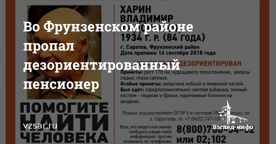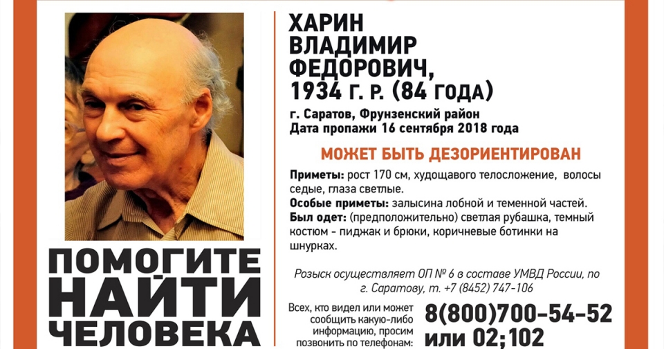 Вчера в Саратове пропал без вести 84-летний Владимир Харин. Об этом сообщают волонтеры "Лиза Алерт Саратов".
