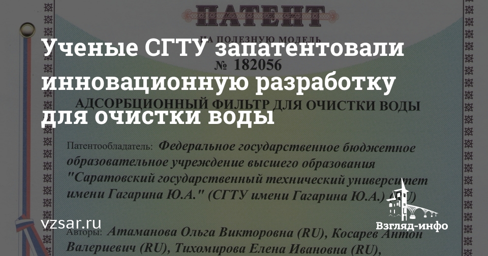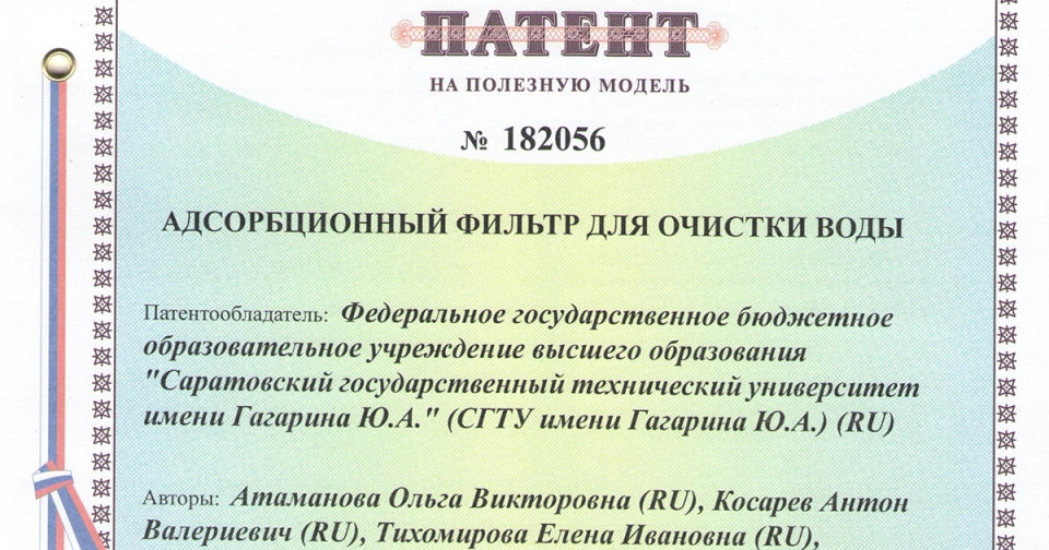 Ученые кафедры "Экология" Саратовского государственного технического университета имени Гагарина Ю.А. получили патент на "Адсорбционный фильтр для очистки воды". Об этом сообщает пресс-служба вуза.