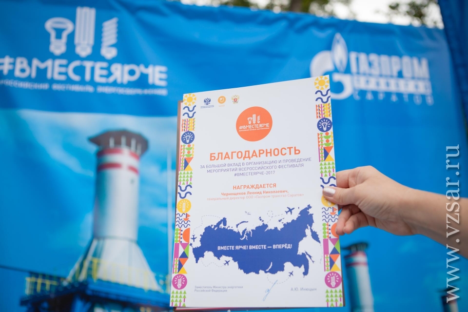 За большой вклад в организацию и проведение мероприятий Всероссийского фестиваля #ВместеЯрче-2017 генеральному директору ООО "Газпром трансгаз Саратов" Леониду Чернощекову и коллективу предприятия была объявлена благодарность Министерства энергетики России.