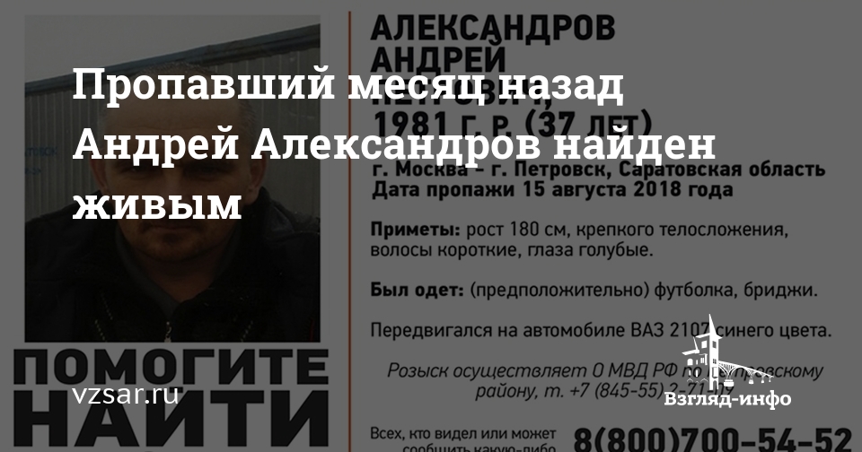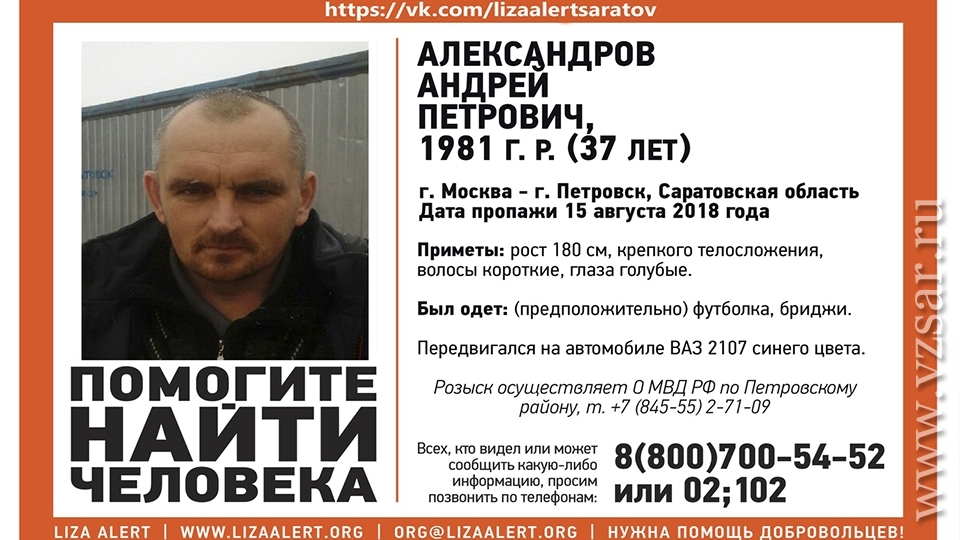 Найден живым 37-летний Андрей Александров, о пропаже которого было объявлено месяц назад. Соответствующая информация появилась в сообществе "Лиза Алерт Саратов" в соцсети "ВКонтакте".