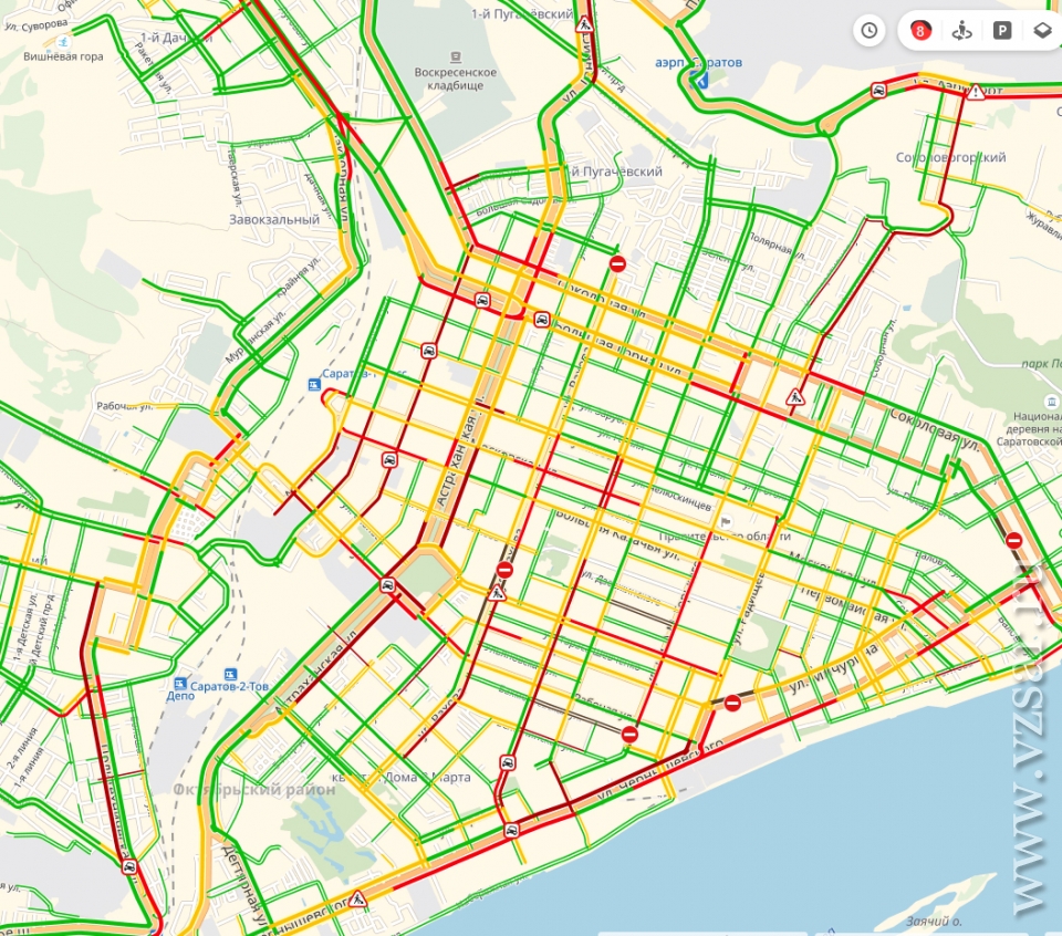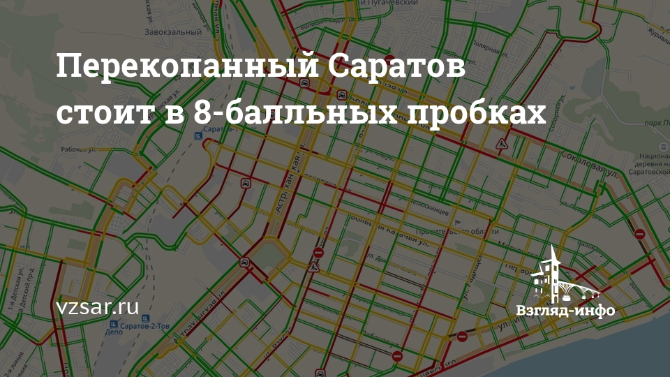 Стоят Чернышевского и проспект 50 лет Октября, Астраханская и Большая Казачья, застыла Привокзальная площадь и Аткарская, скучают водители на Соколовой и Соколовогорской.