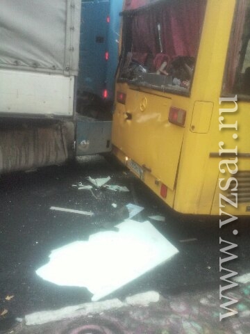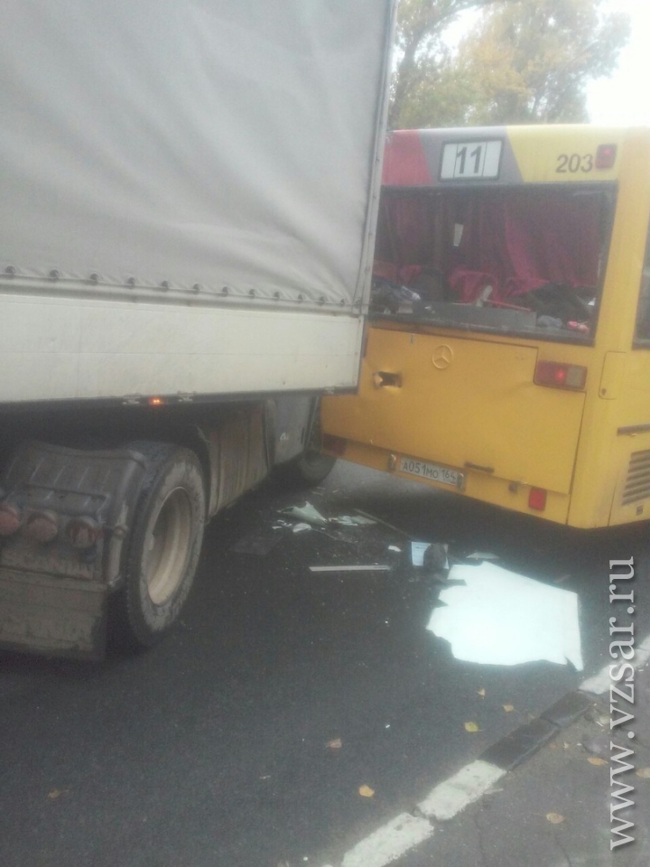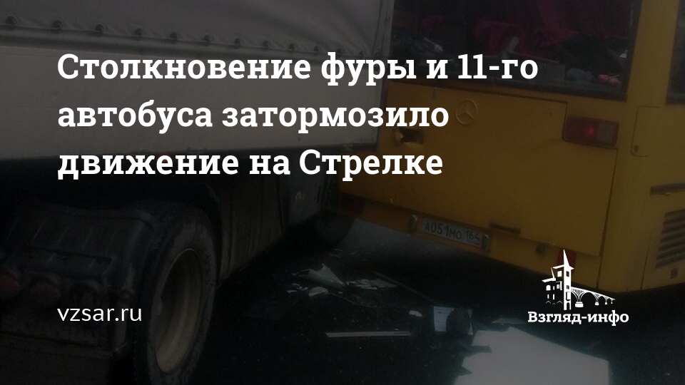 Фура и автобус 11-го столкнулись между мостом и троллейбусной остановкой.
