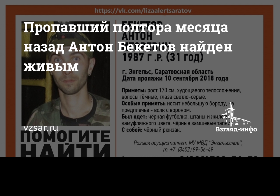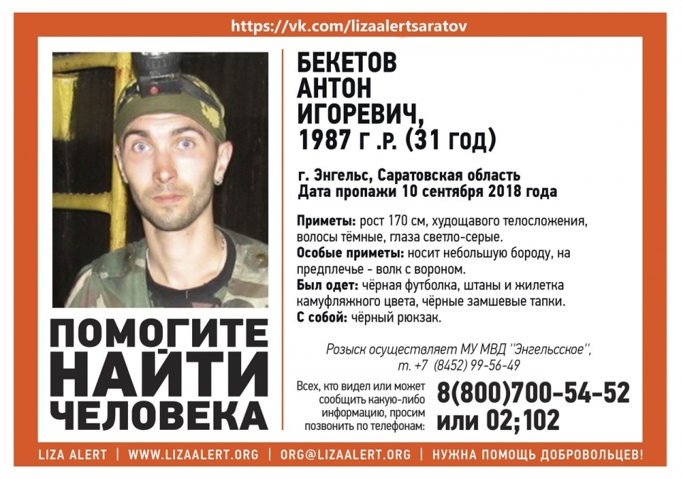Пропавший в Энгельсе Саратовской области 31-летний Антон Бекетов найден живым. Об этом сообщает поисковый отряд "Лиза Алерт Саратов".