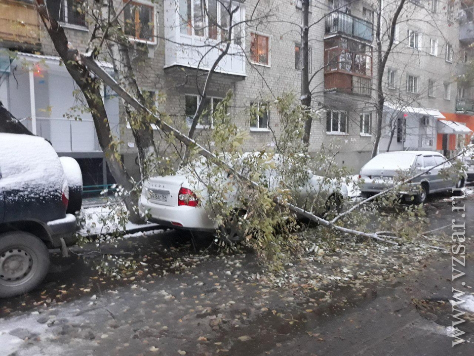 Сегодня утром в центре Саратова от снега и сильного ветра на "Ладу Приору" упало дерево. Фото разместили очевидцы в группе "Саратов онлайн".