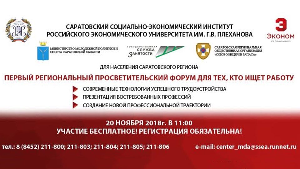 20 ноября 2018 года в Саратовском социально-экономическом институте РЭУ им. Г.В. Плеханова состоится масштабное мероприятие "Первый региональный просветительский форум для тех, кто ищет работу", организованное совместно с ГКУ СО "Центр занятости населения г. Саратова", Министерством молодежной политики и спорта Саратовской области и Саратовской региональной общественной организацией "Союз офицеров запаса".