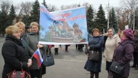 Многие саратовцы держат в руках лозунги и транспаранты: "Россия едина", "Вместе мы - сила", "Россия должна быть единой", "Не допустим новой смуты!"