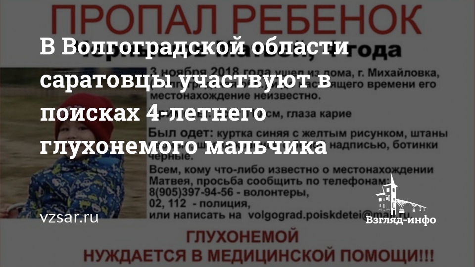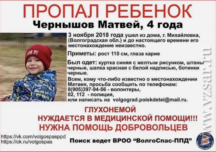 Как сообщили журналистам в пресс-службе СКР по Волгоградской области, сейчас в Михайловке в связи с исчезновением мальчика организована доследственная проверка. По данным следователей, 4-летний Матвей живет вместе с родителями в одном из частных домов Михайловки, пропал мальчик, когда гулял неподалеку от своего двора.