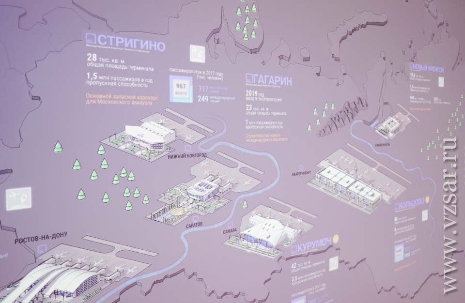 На стенде холдинга "Аэропорты Регионов", разместившемся на площадке ВЦ "Гостиный двор", представлен архитектурный макет пассажирского терминала новых "воздушных ворот" региона и интерактивная презентация. Инсталляция позволяет посетителям оценить архитектурный облик нового саратовского аэропорта и узнать об основных технических показателях проекта.