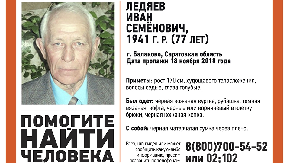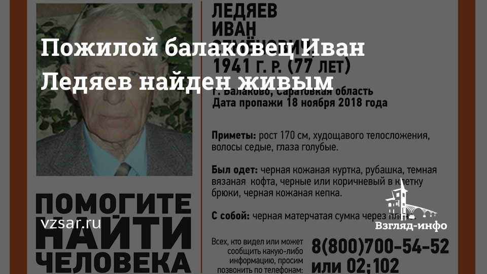 Пожилой балаковец Иван Ледяев найден живым