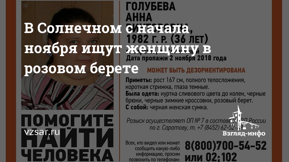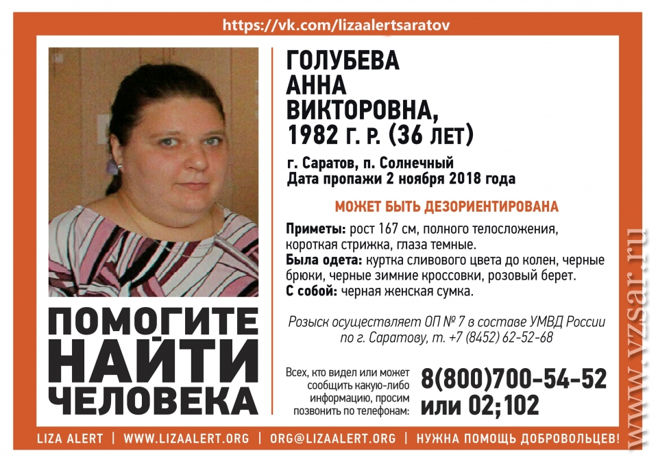 В поселке Солнечный разыскивают 36-летнюю Анну Голубеву. Об этом сообщают волонтеры группы "Лиза Алерт Саратов".