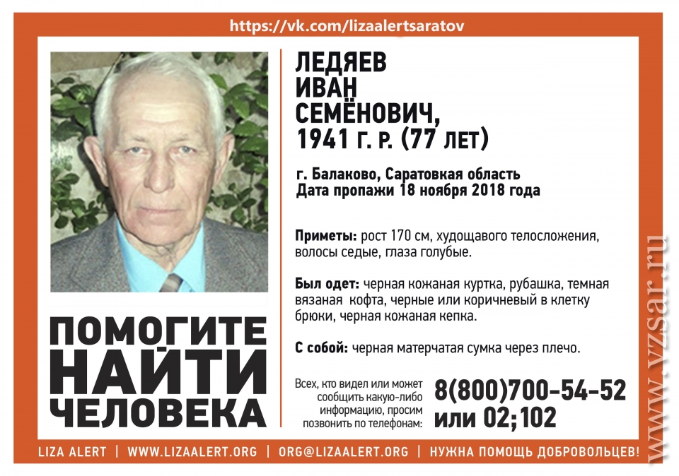 Кроме того, в Балакове 18 ноября пропал без вести 77-летний Иван Ледяев.