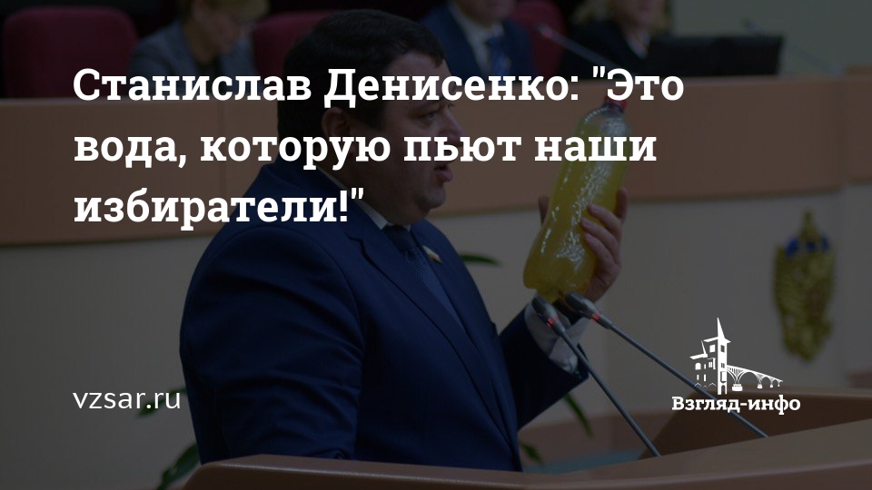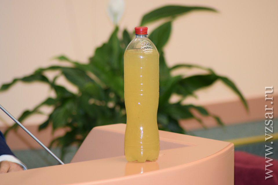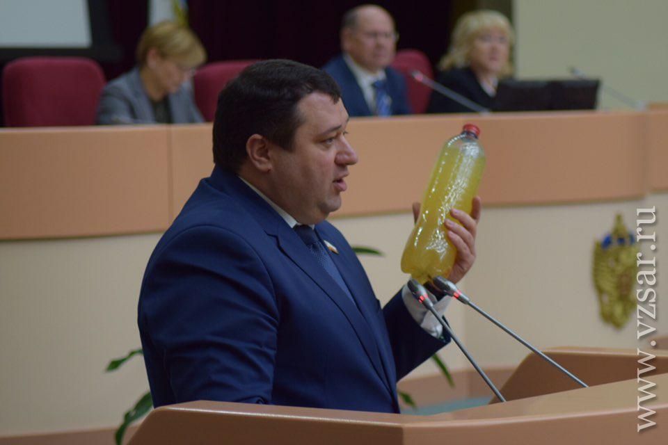 Далее к трибуне вышел депутат Станислав Денисенко (ЛДПР). Он принес с собой полуторалитровую бутылку воды и заявил, что напомнил ее водой из-под крана в Балтайском районе.