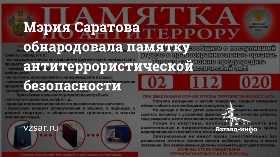 О всех подозрительных предметах, людях и происшествиях немедленно сообщите в Единую дежурную диспетчерскую службу муниципального образования "Город Саратов" по телефону 659-659, 068 (с мобильного телефона), дежурную часть УМВД России по г. Саратову – 51-12-22, дежурную часть УФСБ России по Саратовской области – 37-31-00, 37-30-01, 27-12-96, либо позвоните 01, 02, 112 (с мобильного телефона).
