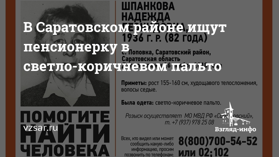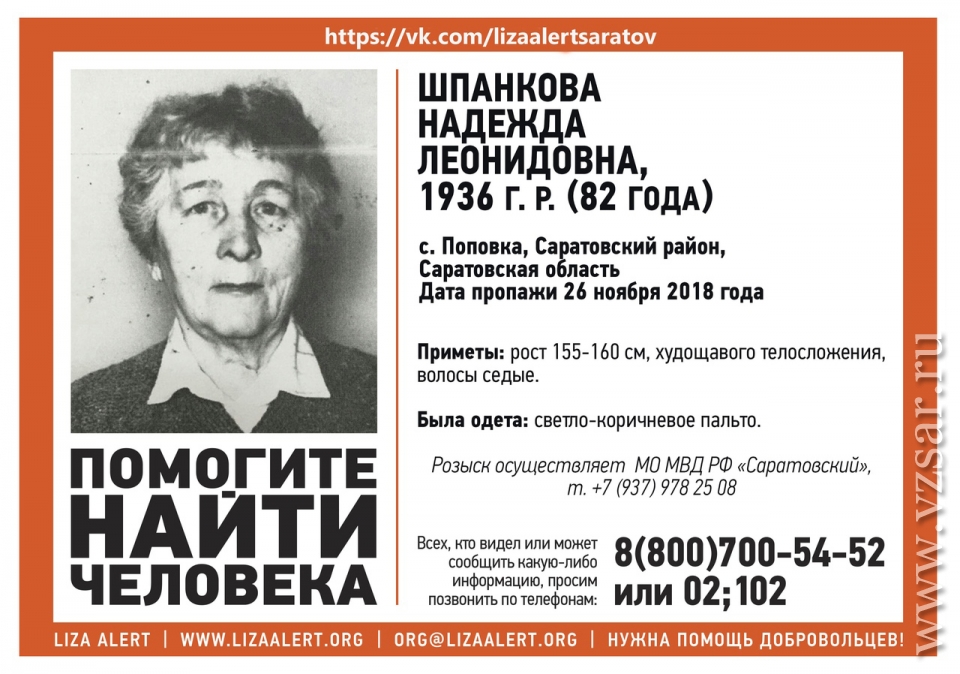 Всех, кто видел или может сообщить какую-либо информацию о Надежде Шпанковой, просят сообщить по телефонам отдела МО МВД РФ "Саратовский" 8-937-978-25-08, а также 8 (800) 700-54-52 или 02, 102.