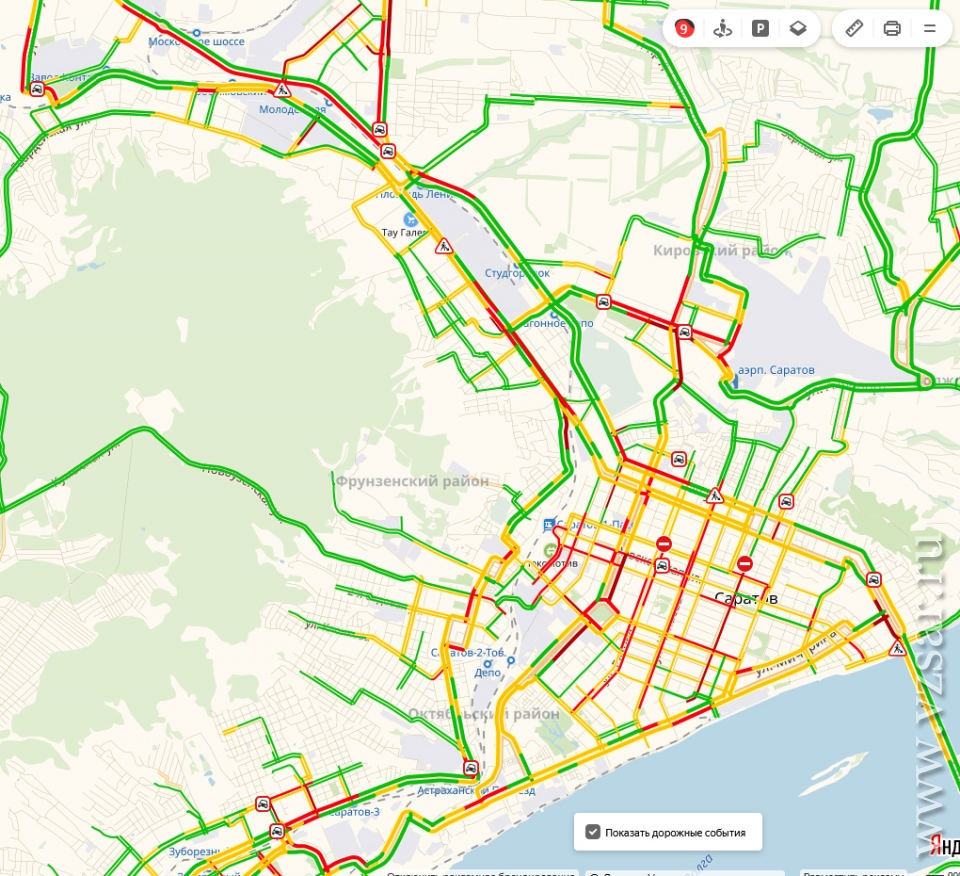 Сегодня вечером жители Саратова вновь вынуждены пробираться домой через девятибалльные пробки. Об этом свидетельствуют данные сервиса "Яндекс.Карты".