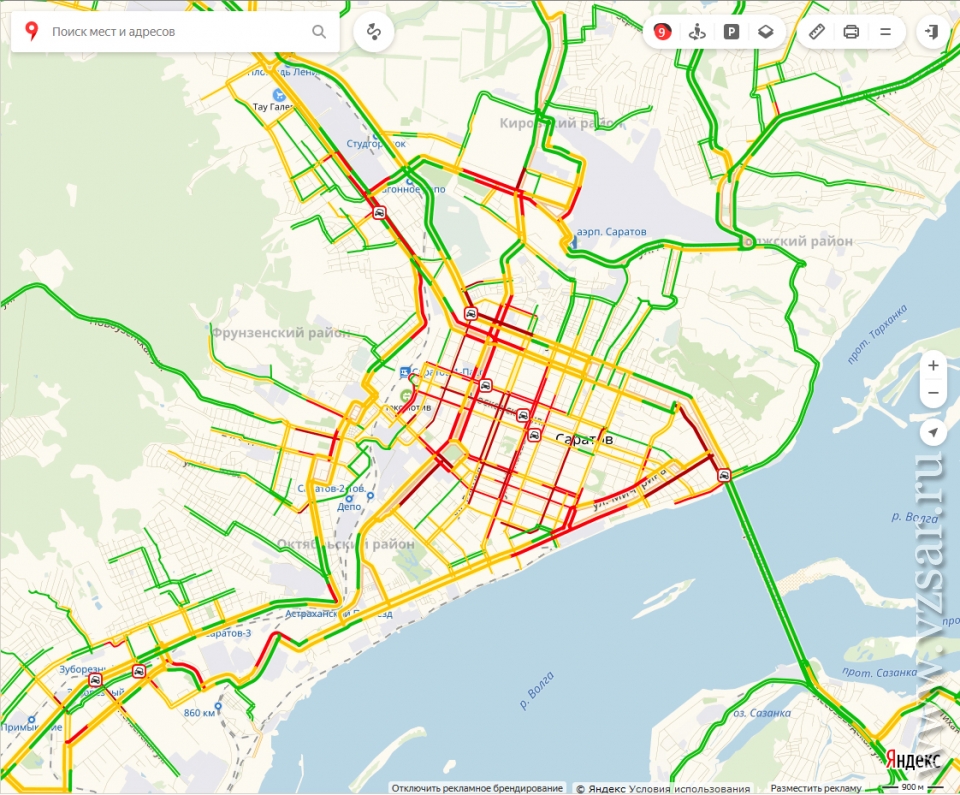 Попытке уехать из Саратова в Энгельс помешает ДТП на Славянской площади – оно спровоцировало километровый затор на Большой Горной и пробки на прилегающих участках Чернышевского и Большой Затонской. На самом мосту пока проблем не наблюдается.