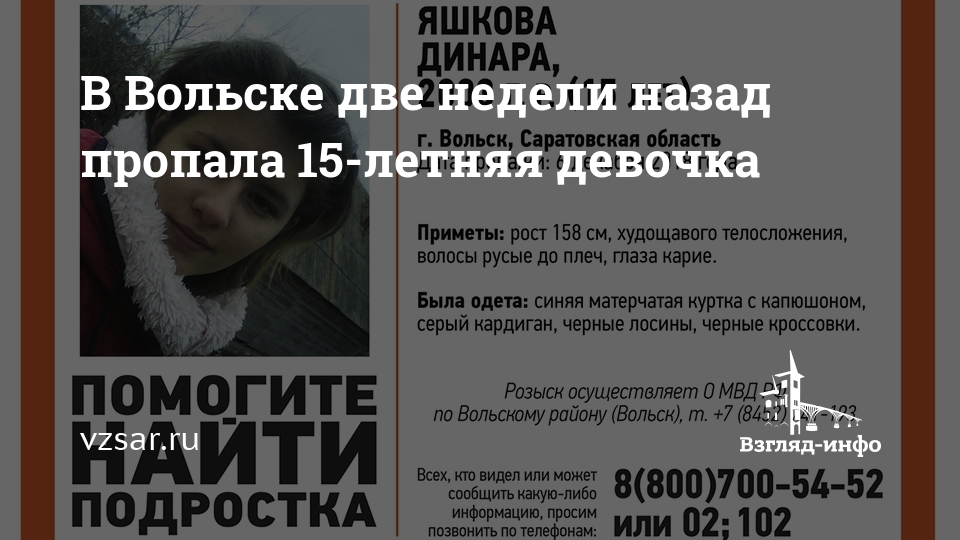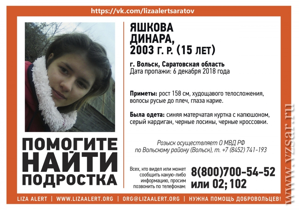 С 6 декабря родные в Вольске ничего не знают о 15-летней Динаре Яшковой. К поискам подростка присоединились волонтеры сообщества "Лиза Алерт Саратов".