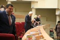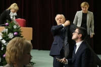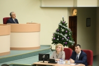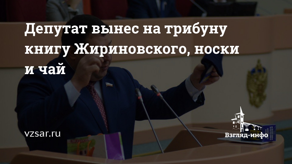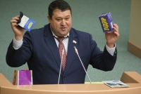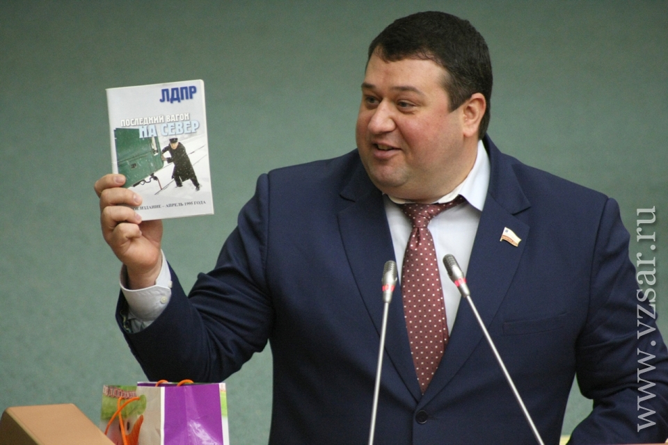 Депутат Станислав Денисенко (ЛДПР), следуя примеру коллег-коммунистов, подготовил инсталляцию. Он принес в парламент пакет новогодних подарков. В частности, он достал из него книгу Владимира Жириновского "Последний вагон на север", носки с партийной символикой и чай.