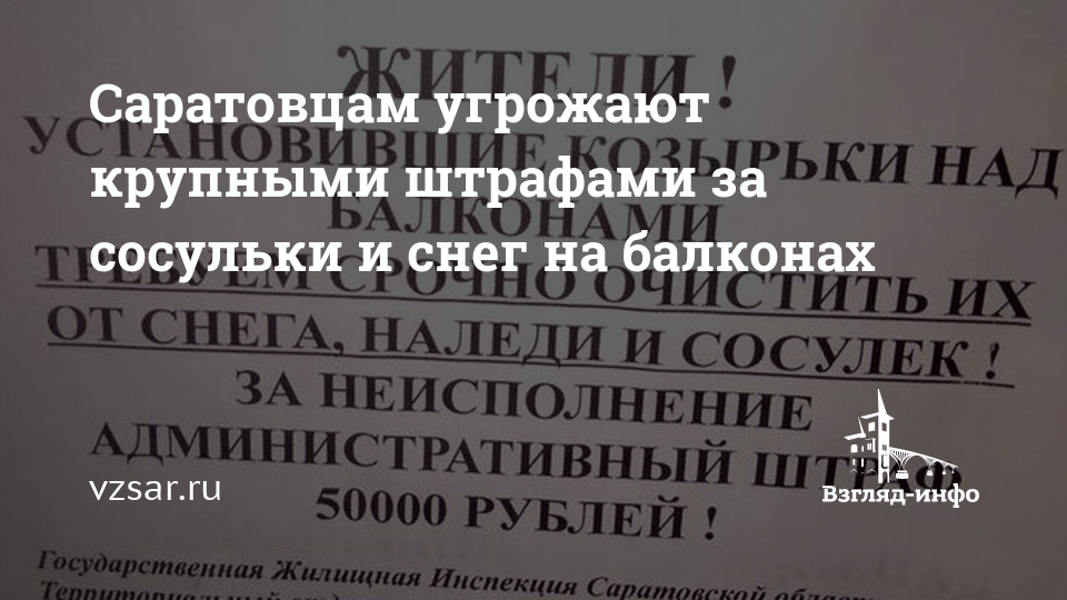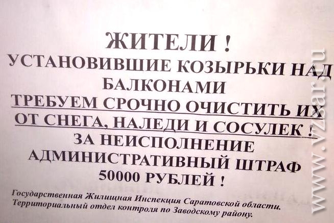 В Саратове неизвестные распространяют листовки с угрозами от имени Госжилинспекции. Как сообщает пресс-служба ведомства, на подъездах жилых домов кто-то расклеивает объявления, в которых содержится требование к жильцам очистить от снега и сосулек козырьки над балконами. За неисполнение гражданам якобы грозит штраф в размере 50 тысяч рублей. В частности, подобные листовки были обнаружены на доме №30 по ул. Ново-Астраханская.