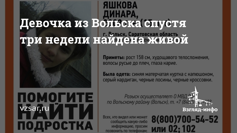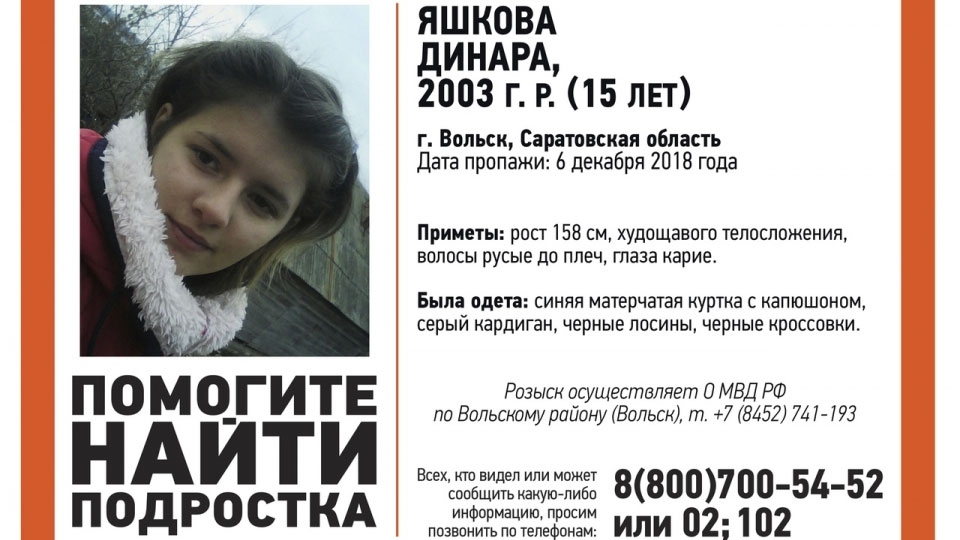15-летняя Динара Яшкова из Вольска найдена. Сегодня об этом сообщают волонтеры сообщества "Лиза Алерт Саратов".