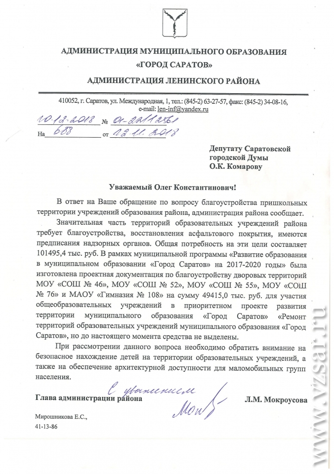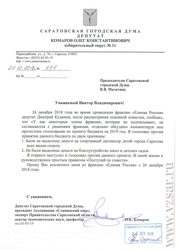 С уважением, депутат Саратовской городской думы, президент Ассоциации "Славянский мир", эксперт правительства Саратовской области, доктор экономических наук, профессор Олег Комаров", - говорится в документе.