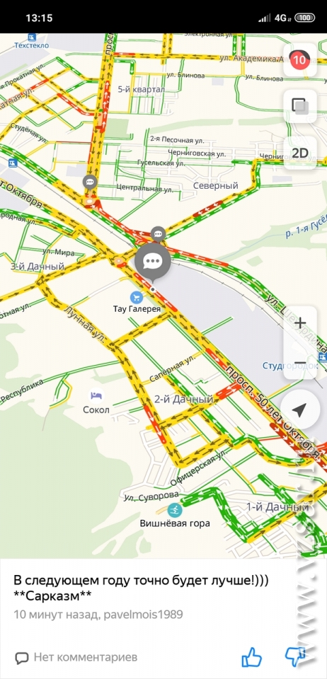Только смелые авантюристы рискнут сунуться в бордовый центр города. В квадрате Астраханская – Рабочая – Горького – Соколовая скорость движения не превышает 3-5 км в час. Усугубляет обстановку авария на пересечении Кутякова/Рахова.