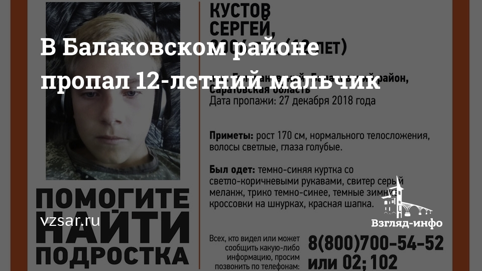В Балаковском районе Саратовской области без вести пропал 12-летний Сергей Кустов. Об этом сообщает поисковый отряд "Лиза Алерт Саратов".