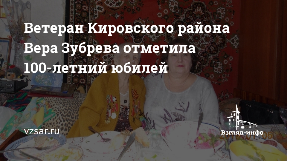 Вчера ветеран войны, жительница Кировского района Саратова Вера Зубрева отметила 100-летний юбилей. От имени депутата Саратовской областной думы Сергея Курихина с праздником ее поздравила руководитель приемной парламентария Людмила Урмаева.