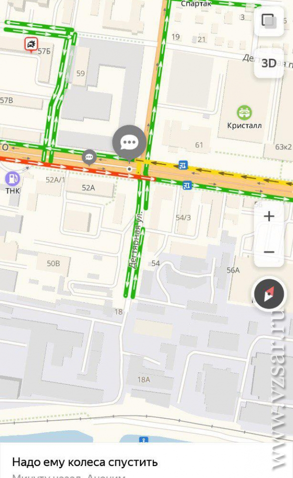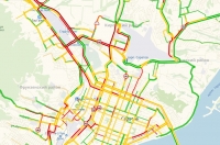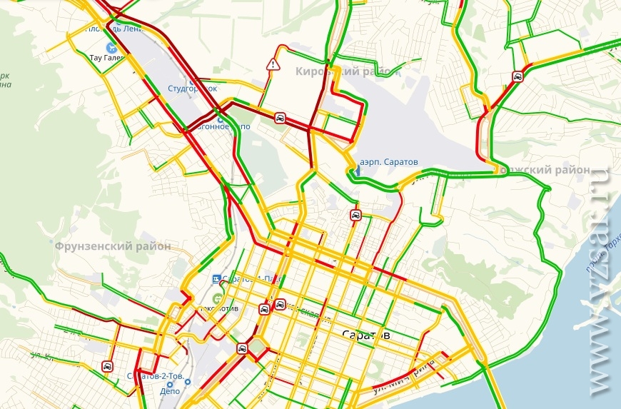 Застыло в пробке и Ново-Астраханское шоссе. Традиционно стоят Рабочая, Чапаева, проспект 50 лет Октября, улица Тархова, Соколовая, Шехурдина, Танкистов. Выезд из Ленинского района окрашен в багровые тона.