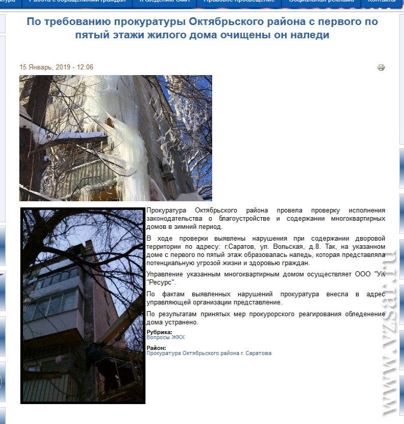 Надзорный орган внес представление управляющей организации ООО "УК "Ресурс", которая, по информации прокуратуры, полностью убрала ледяную колонну с угла дома. В подтверждение на сайте надзорного ведомства размещены фотографии "до и после" прокурорского реагирования. На втором фото видно, что наледь счищена полностью, в том числе с проводов, веток деревьев и кондиционеров.