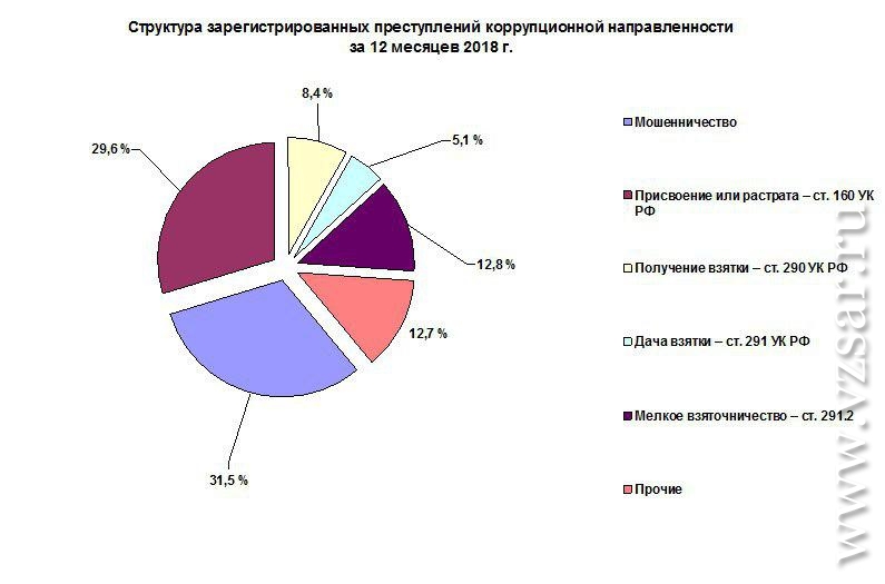 Наибольший удельный вес в структуре преступлений коррупционной направленности имеет мошенничество (31,5%). На втором месте находится присвоение или растрата (29,6%), а на третьем – мелкое взяточничество (12,8%).