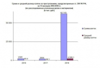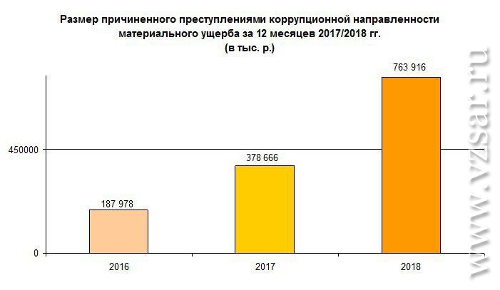 Размер ущерба, причиненного коррупцией, по сравнению с 2017 годом вырос более чем в два раза – с 378 666 рублей до 763 916 рублей. Колоссально увеличились сумма и средний размер взятки.