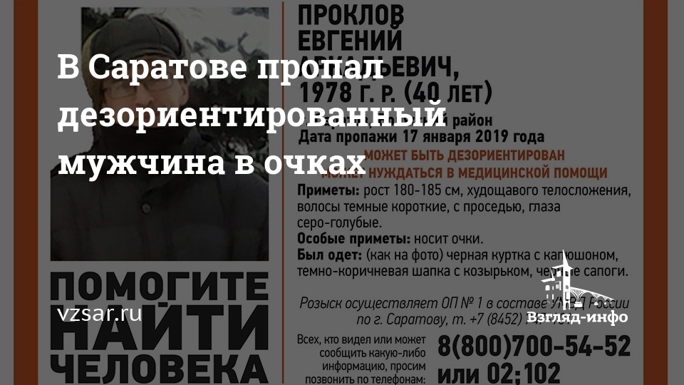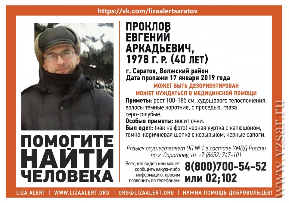 В Волжском районе Саратова разыскивается 40-летний Евгений Проклов, пропавший без вести 17 января. Об этом сообщают волонтеры сообщества "Лиза Алерт Саратов" в соцсети "ВКонтакте".