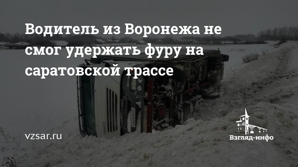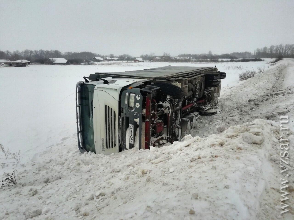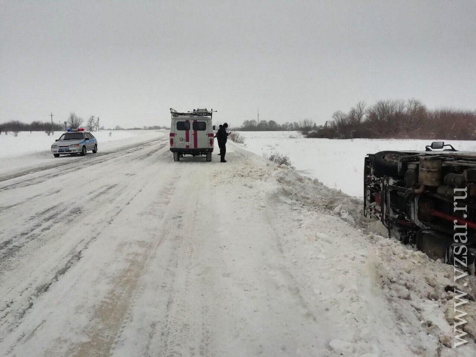 В Ртищевском районе Саратовской области с трассы слетела и опрокинулась груженая фура. Об этом сообщает облспас.