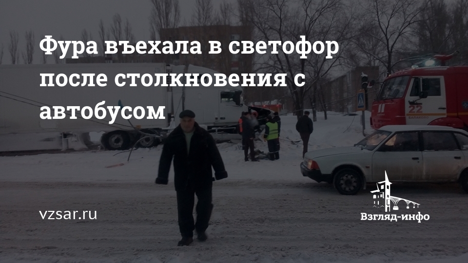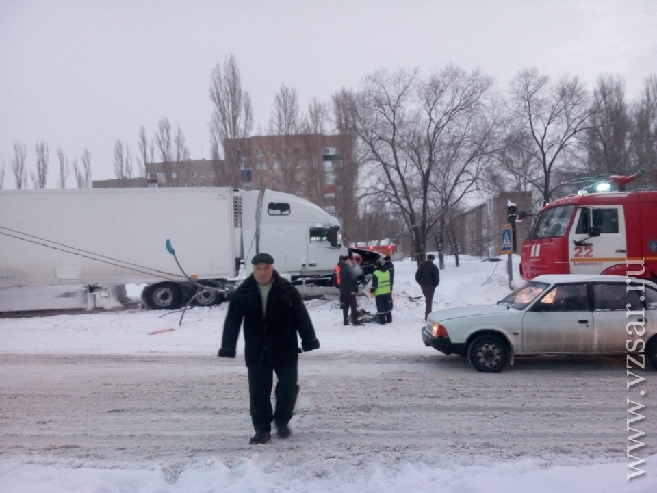 Авария произошла сегодня около 6.00 на пересечении улиц Вокзальная и Комарова. Столкнулись автобус "ПАЗ" маршрута № 5 и большегруз "Вольво". После этого фура врезалась в светофор.