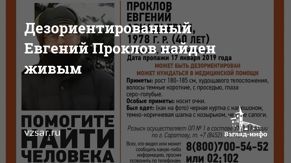 "Найден, жив Проклов Евгений Аркадьевич, 1978 г. р. (40 лет)", - говорится в коротком сообщении отряда.
