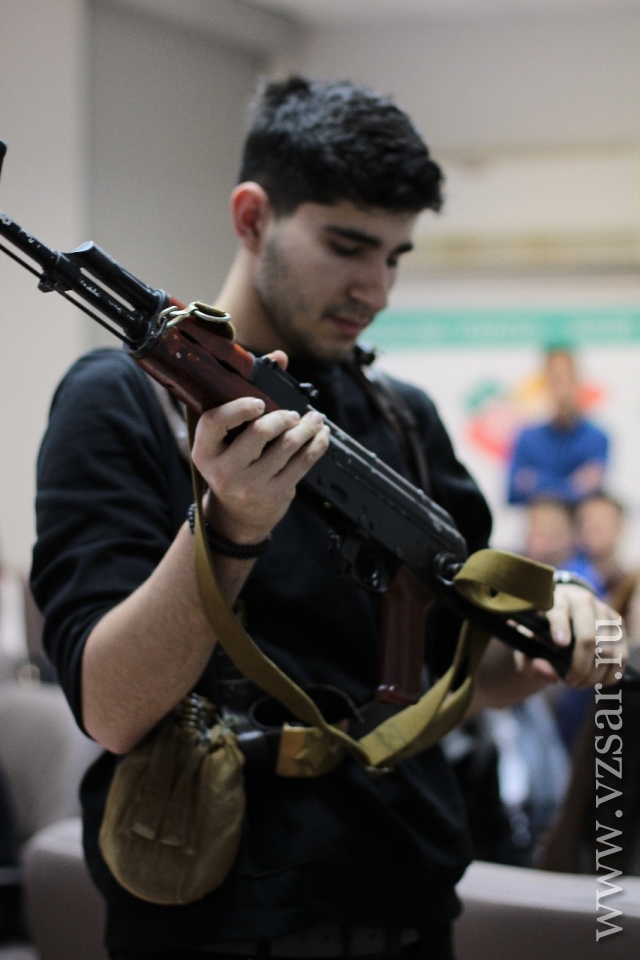 Студенты вспомнили историю памятной даты, нашего института и вооруженных сил России, великие Победы и Героев - защитников Отечества. Участники на скорость надевали военную амуницию, определяли название и сущность исторических артефактов.