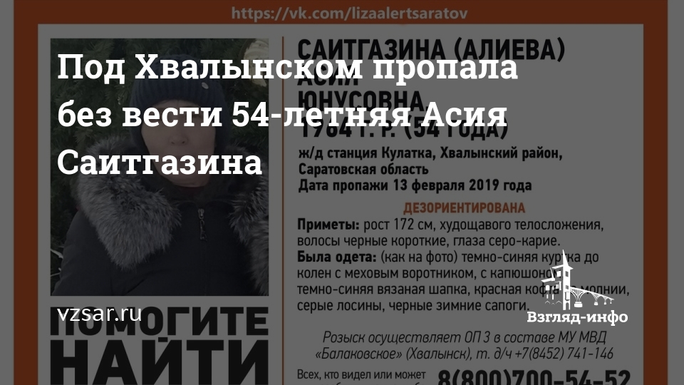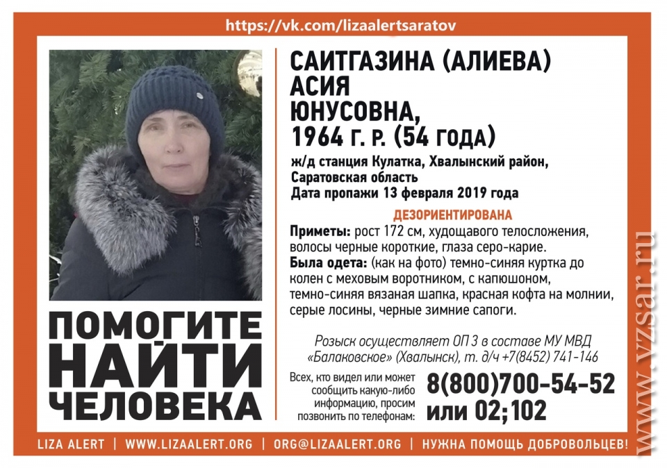 В Хвалынском районе Саратовской области пропала 54-летняя Асия Саитгазина (Алиева). Об этом сообщают волонтеры сообщества "Лиза Алерт Саратов" в социальной сети "ВКонтакте".