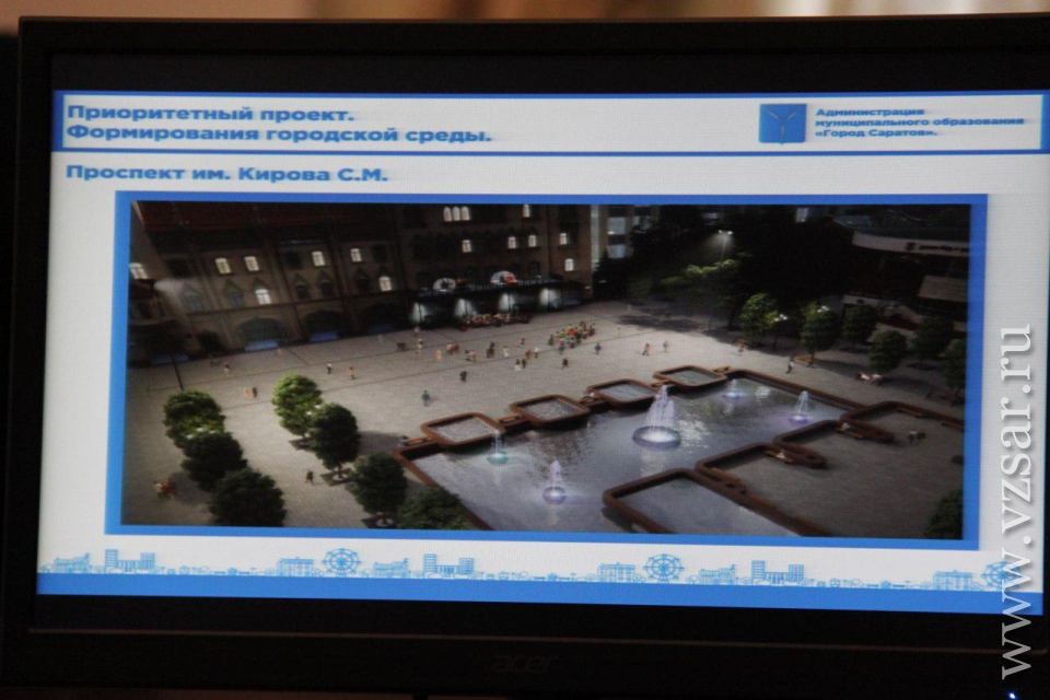 На первых слайдах презентации был представлен проспект Кирова. Говоря о фонтане перед цирком, главный архитектор отметил, что ему стоит "вернуть светомузыкальную функцию". Также Желанов напомнил о необходимости реконструировать фонтан в сквере Первой учительницы.